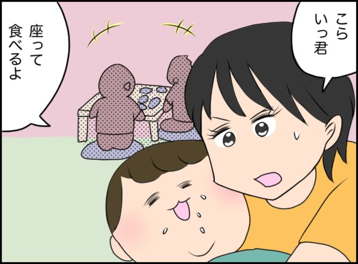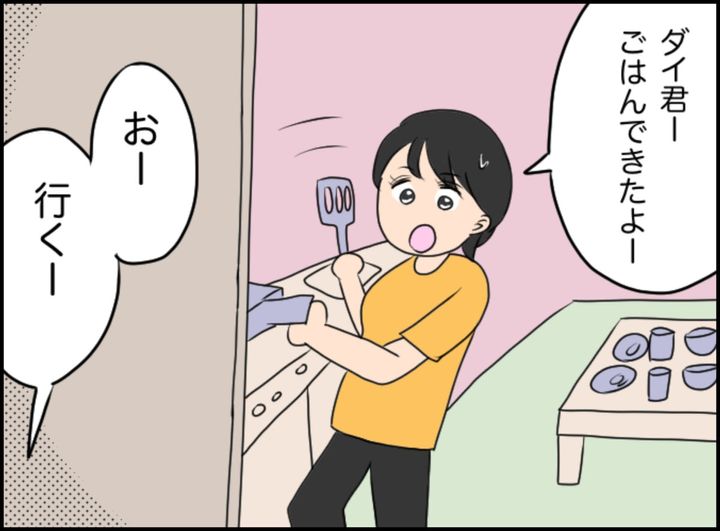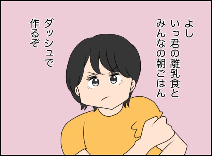 家族のごはんを作って逃げ回るいっ君を捕まえて食べさせて…かなりハードな朝ですよね。これも嫁の務めなのでしょうが、思わず心の中で助けを求めるユメさん。