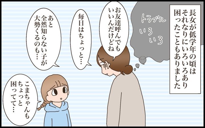 例えば約束していないのにどんどん人が集まっちゃったり、違うクラスの知らない子までいたり、仲がいいわけではないのに毎日来たいと言われたり、遅くなってもなかなか帰ってもらえなかったり、ちょっとしたトラブルに巻き込まれたり…etc.