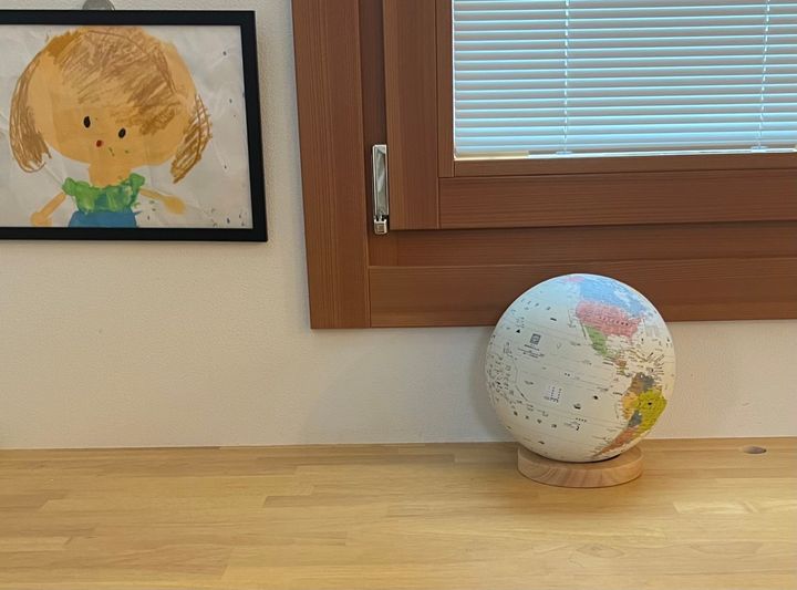 小さめ(直径15cm)の国境がなく本当の地球のタイプと、国境や国名入りの大きめ(直径20cm)タイプがあって、わが家は国名入りの大きめのものにしました。