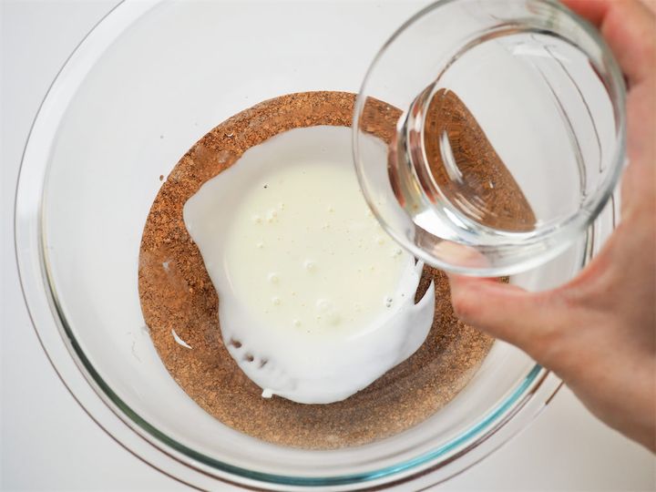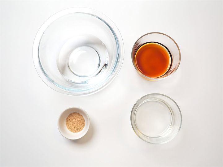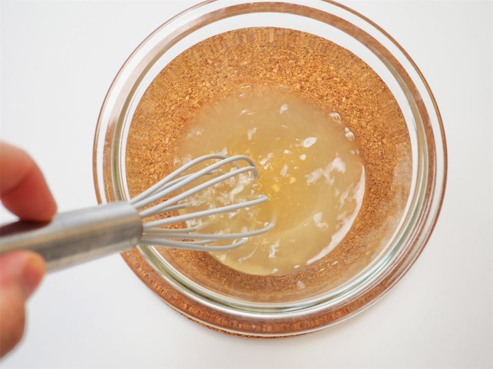 1. 耐熱容器に水、みりん、だしを入れよく混ぜ合わせ、600Wの電子レンジで1分30秒加熱する。加熱後、再度かき混ぜる。