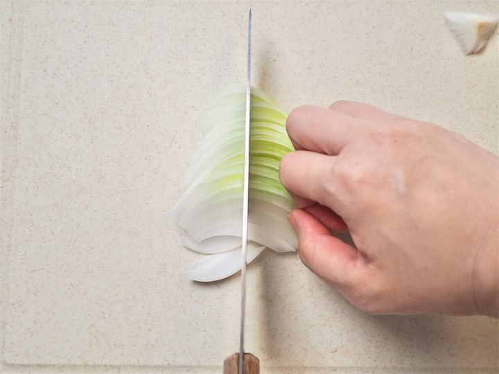 6. 玉ねぎの皮や芯を取り除き、薄切りにしたら、さらに半分に切る。