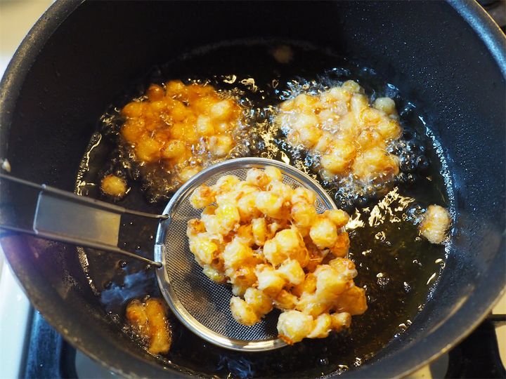 10. 7のとうもろこしをスプーンですくい油に入れ、カリッとするまで約3分ほど揚げていく(8の玉ねぎ&青のり入りも同様に揚げる)。揚がったらバットなどで油を切って完成です。