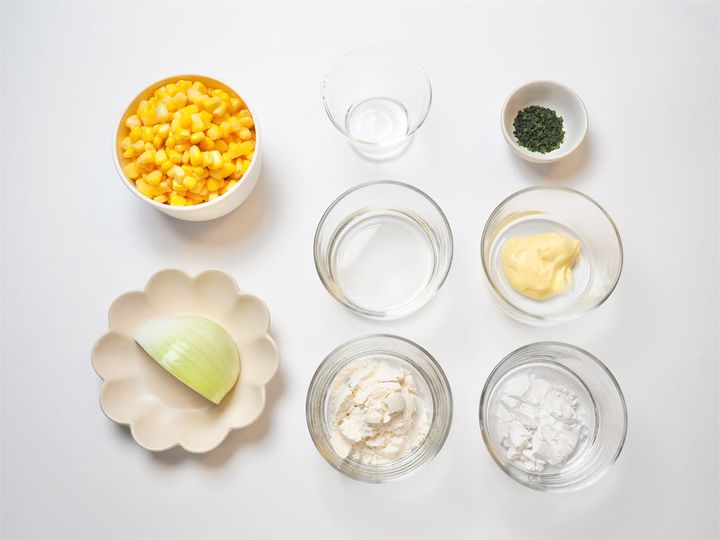 コーンは缶から出し、しっかり水切りしておきましょう。このレシピでは、プレーンのとうもろこしのかき揚げと青のりと玉ねぎも入ったバージョンの2種類を作っていきます。