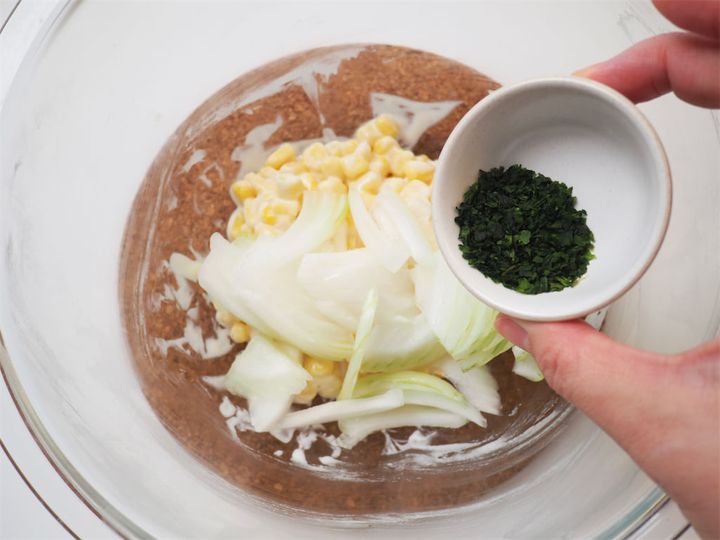 8. 7で別にしておいたボウルに玉ねぎ、青のりを加えよく混ぜ合わせる。