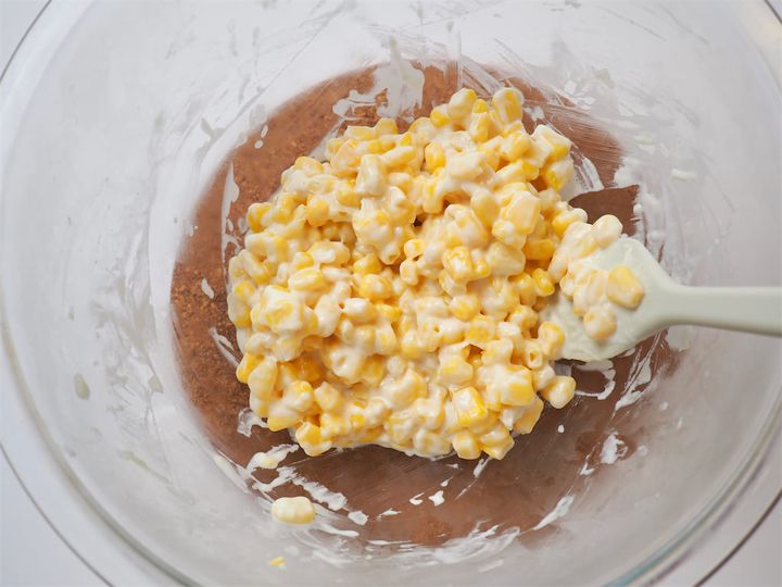7. 5の衣の入ったボウルを冷蔵庫から取り出しラップを外し、とうもろこしを加え絡めていく。絡めたら、半分別のボウルに移しておく。
