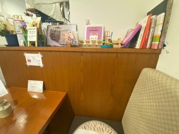 お子連れにもとても優しいカフェで、ベビーチェア・オムツ替えスペース・おもちゃや絵本もあります。キッズサイズドリンク100円・お子様タコライス(ドリンク付き)500円でいただくことができます。
