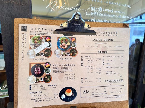注文後番号カウンターが渡されます。テトテヲの定食3種類から、私は魚定食を選びました。お盆にたくさんのおかず、わくわくします。