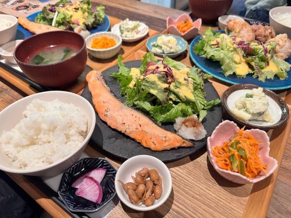 手元のブザーが鳴ったので、プレートを取りに行きました。シャケがふっくらと柔らかくて美味しかったです。サラダのドレッシングもたっぷりとかかっていて、ボリューミー。ご飯は半ライスにしてもらえばよかった!