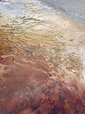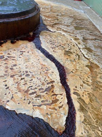 長い年月を経て形成された温泉の足跡、色合いも凄し!この天然の湯の花ごつごつが私の足裏に効き、そろりそろりと浴槽の間を移動。