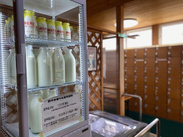 おふろ上がりの牛乳も♪大正時代から旧大野町(現北斗市)で酪農業を営む「鈴木牧場牛乳」を飲めます。200ml (150円)、900ml(500円)、アイス(400円)なり。
