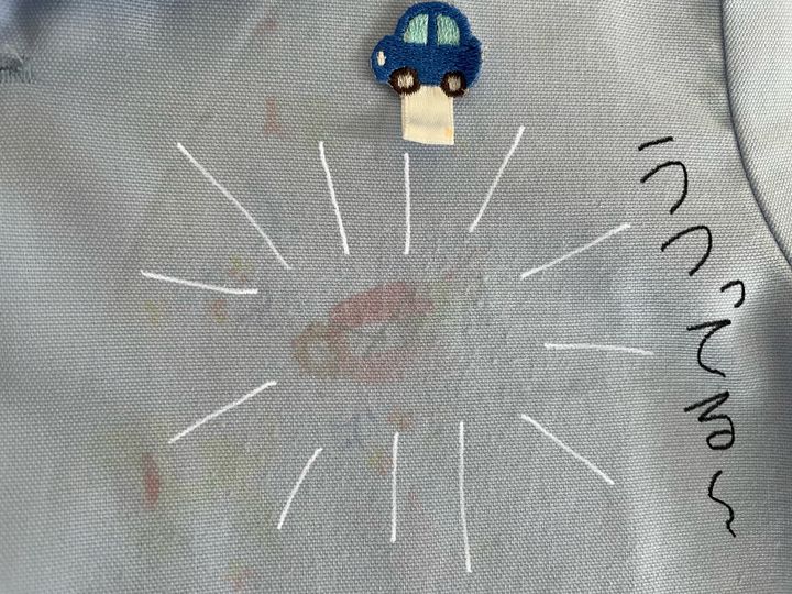 とりあえず、名札で少し隠れるので時々、着て登園しています。