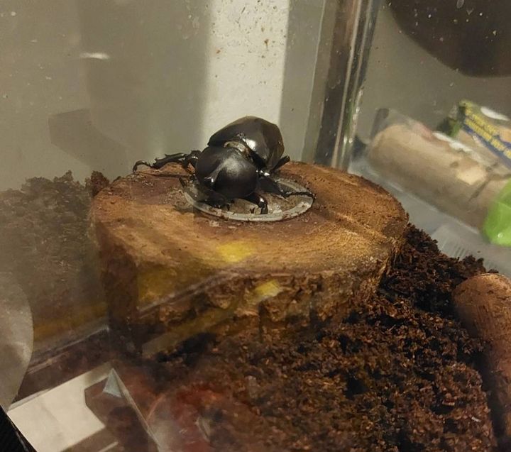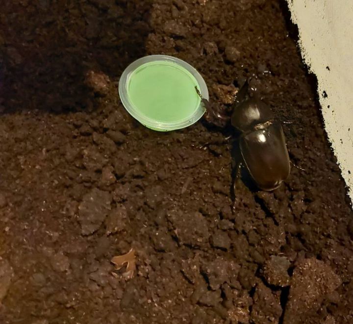 しばらく様子を見ていましたが、動く気配はなく数時間後に子供達と一緒に見てみるとオスのカブトムシが土の上に出て歩いていました。