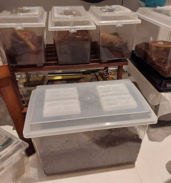 ペットボトルなどを使って1匹ずつ幼虫を育てた方がいいと聞きましたが14個もペットボトルを置くスペースもなく大きな飼育ケ-スが2つあったので1つのケ-スに7匹ずつ幼虫を入れて育てることにしました。
