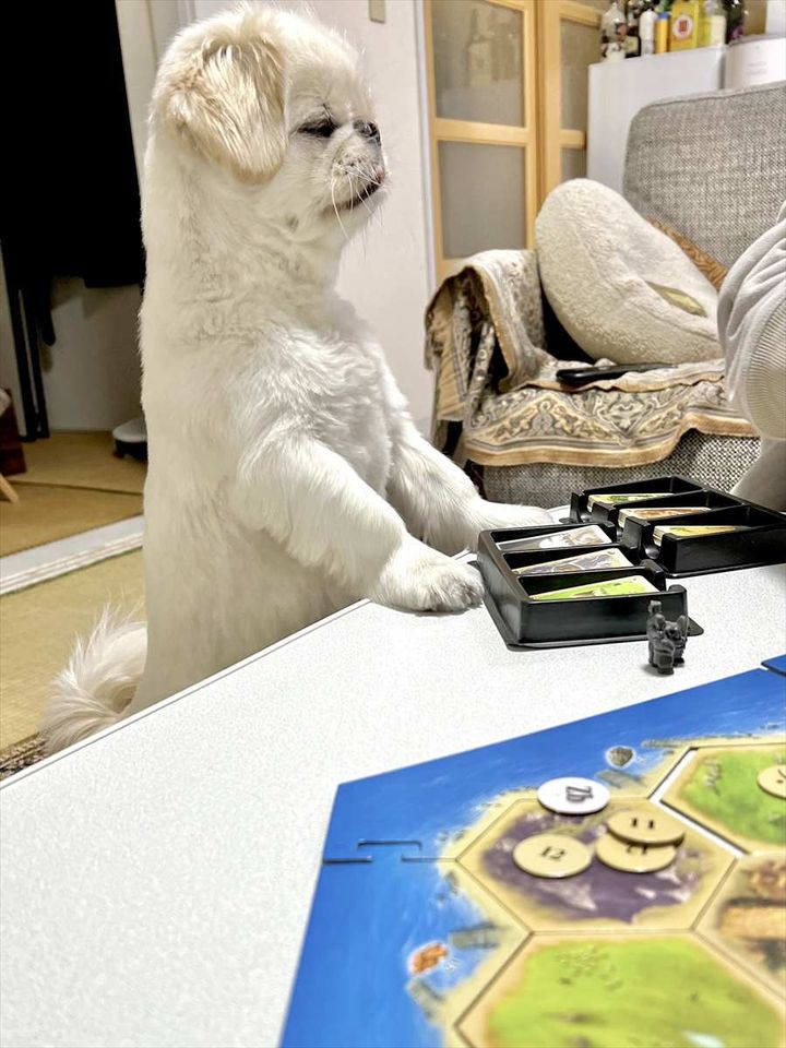 ご紹介するのは、𝐿𝑂𝑉𝐸𝑌𝑂𝑈(@The_Mucho_World)さんがXに投稿された写真。 愛犬のペキニーズ『ムーチョ』ちゃんが、ボードゲームに参加しにきたとのことですが・・・。