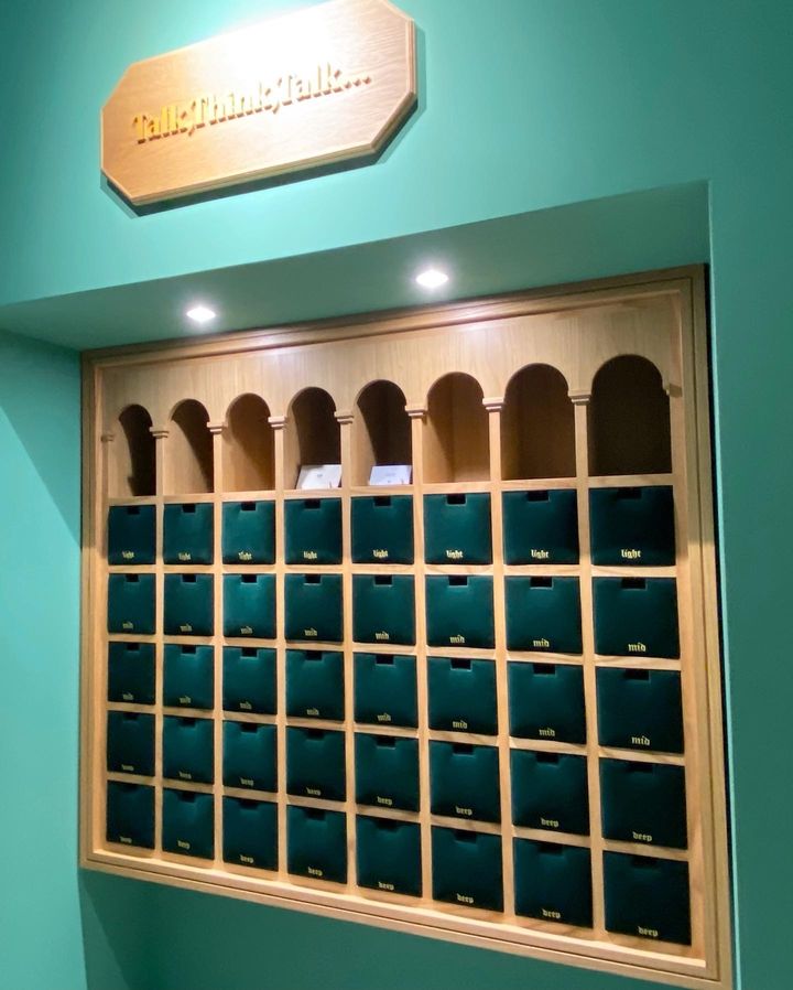 メインとなるスイーツを、詳しい説明が書かれたおしゃれなイラストの中から選びます。選んだら、グリーンの引き出しの前に移動します。引き出しにはライト、ミディアム、ディープの3つがあり、それぞれ質問内容の深さを示しています。好きな引き出しから1通ずつ、合計3通の封筒を取り出し、席に戻ります。