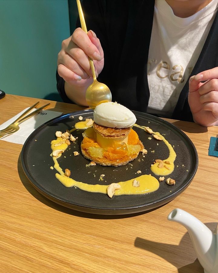 友人が食べていたのは、同じく7月末までの期間限定スイーツ「オーキッド(蘭)」のアイスをトッピングしたパイです。柑橘がたっぷり乗ったパイの周りには、カミカツビールのブールブランソースとローストしたカシューナッツが飾られます。カミカツビールのブールブランソースはほんのり麦とフローラルな香りがする大人な味で、統一されたカラーも美しいスイーツです。