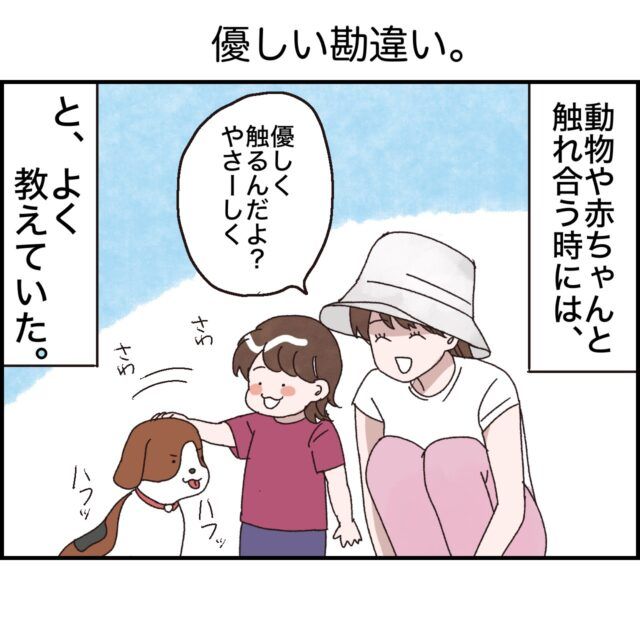 1歳女の子のママであるしおさんから、優しい勘違いのお話です。娘ちゃんが動物や赤ちゃんと触れ合うときによく「優しく触るんだよ?」と教えていたしおさん。あるとき、「優しく」と言われた娘ちゃんは・・・。