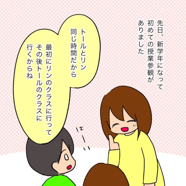2人兄妹のママであるメイさんから、授業参観のお話です。リンちゃん、トールくん同じ時間に授業参観があったようで・・・