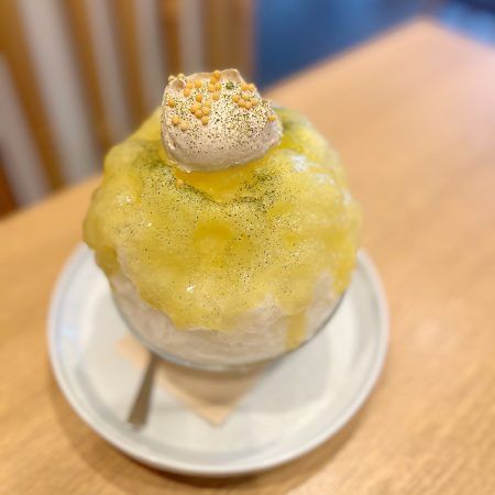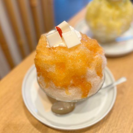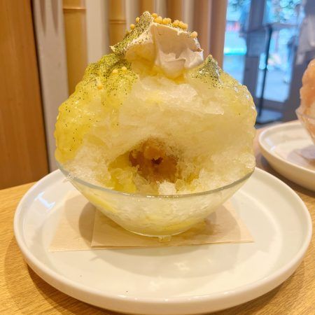 桃とジャスミンは間違いない組み合わせですよね! 上には、なんと自家製杏仁豆腐をのせています。ちょっと固めで、つるんとした杏仁豆腐の食感がかき氷との絶妙なコントラストを生んでいました。