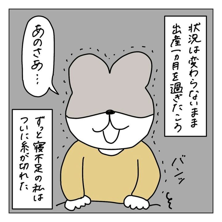 この漫画は、赤ちゃんの夜中のお世話をめぐり、夫婦ですれ違い、話し合った記録を漫画化した作品です。夜泣き対応を1人でこなす主人公・ぬんさん。とうとう出産から1ヶ月が過ぎました。毎日寝不足でイライラし、ついに糸が切れたぬんさんは夫に気持ちをぶつけますが…。ぬん(@nun__blog)さんによる漫画『ウチのパパはゼッタイ起きない』第5話をごらんください。