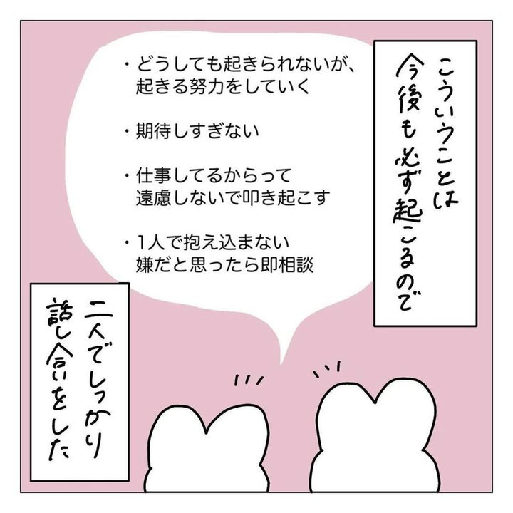 出産後も、家事に育児にやることが尽きない妻。夜泣き中も本当はもっと寝たいのに、わが子を無視するわけにはいかないという状況でしょう。そんな葛藤をしている横でグーグー寝ている夫を見たら「夫には育児の責任がないの?」「どうしてわかってくれない?」という気持ちになるのは当然のことです。一方、ぬんさんの夫には夫なりに、起きられない理由や反省の気持ちがあったようです。