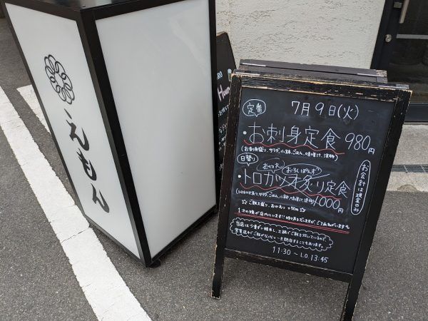 日替り定食が大好きなるなるなですが、えもんさんでは、定番のお刺身定食をいただきます。毎回、その日の旬の新鮮なお魚のお刺身盛りがいただけるからです。でも、今回の日替り定食は、トロカツオ炙り定食ですね。そそられますね。るなるなと同じ気持ちの人が多かったのでしょう。売り切れですね。