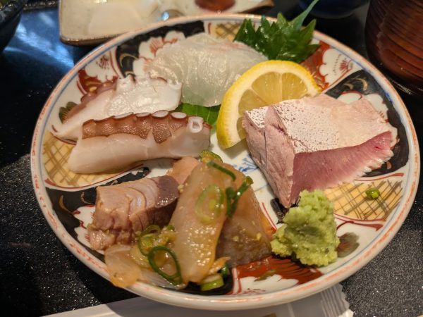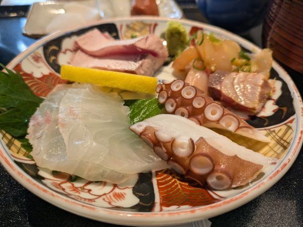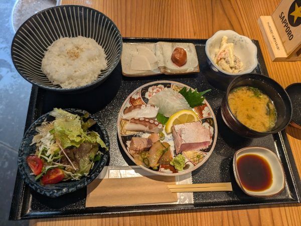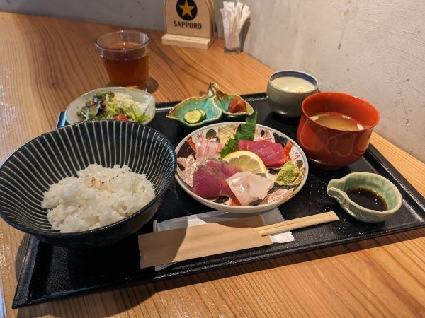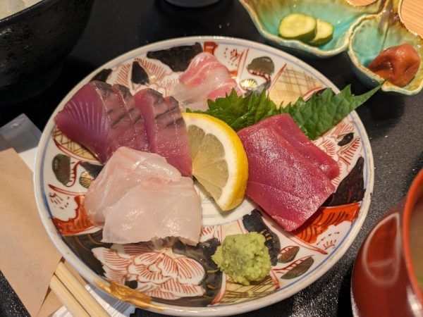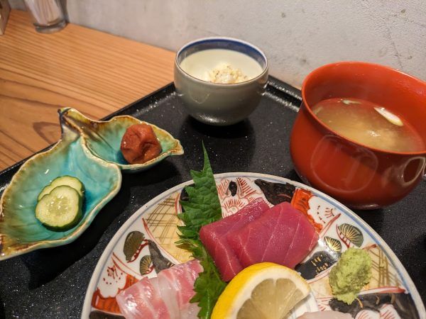 この日は、海鮮わさび醤油漬け・明石たこ・鯛・天然ぶりの霜降りです。どのお刺身も厚めに切ってあるのが嬉しいですね。そして、新鮮!食感も歯応えもいいです。毎回、旬の新鮮なお刺身盛りがいただけるので、ついついお刺身定食を注文してしまうるなるなでした。