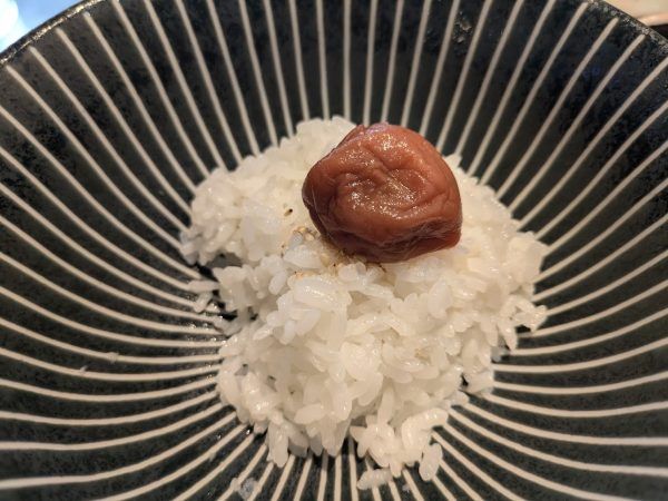 土鍋で炊いたご飯はツヤツヤでふっくらとしていておいしいです。半分ぐらいそのまま食べて、もう半分は大きい梅干しでいただきました。久しぶりです。おいしいです。