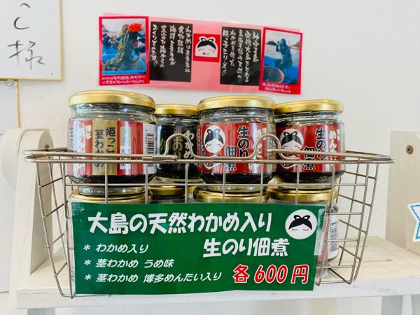 カフェ姫っこでは、大島の天然わかめ入り生のり佃煮や、ふりかけなども販売しています。 国内で流通しているわかめは輸入が多く、国産のわかめもほとんどが養殖。天然のわかめの割合はわずか1%ほどなのだそう。 そんな大島の恵まれた環境で採取された天然わかめは、今でも素潜りで採取しているんですって。 「漬け丼には、わかめがたっぷり入っているのでぜひ味わってみてください」と河辺さん。