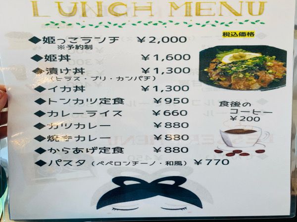 ランチメニューは、予約制の姫っこランチをはじめ、姫丼、漬け丼、イカ丼などがあります。 姫っこランチは、大島産の旬のお刺身(日によって内容が変わります)、小鉢2種、ご飯、味噌汁、その時々によって魚のフライや煮付けが提供されるそうです。 お値段は税込2,000円。予約必須で予約はホームページからでも受け付けていますが、電話の方が確実とのこと。