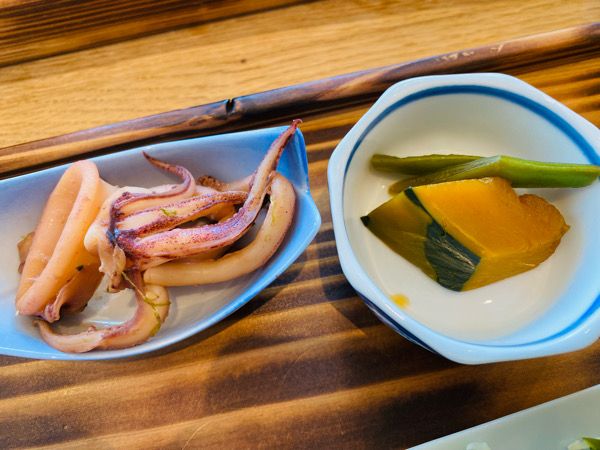 小鉢はイカの煮付けとカボチャの煮物。どちらも優しい味付けでご飯が進みます。