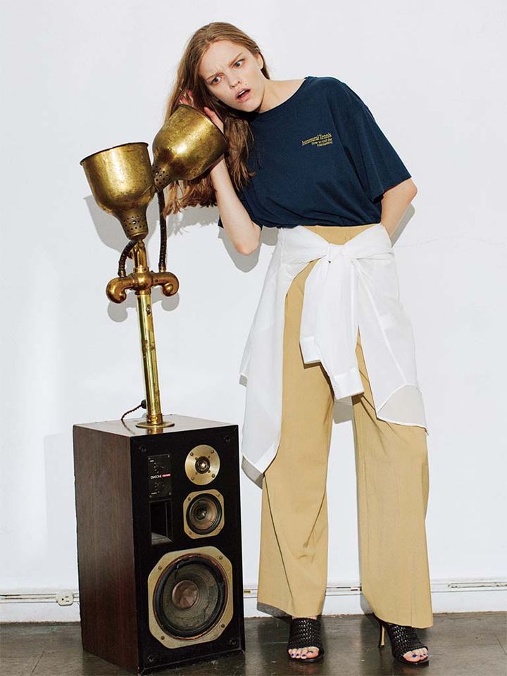 優雅なベージュの気品に合う小さくあしらったレタリングロゴ。細いラインであしらうことで、目を引く胸元でカラーをとり入れても悪目立ちしない。ベージュパンツと同系色のイエローで、真逆のテイストMIXをまとまりよく。