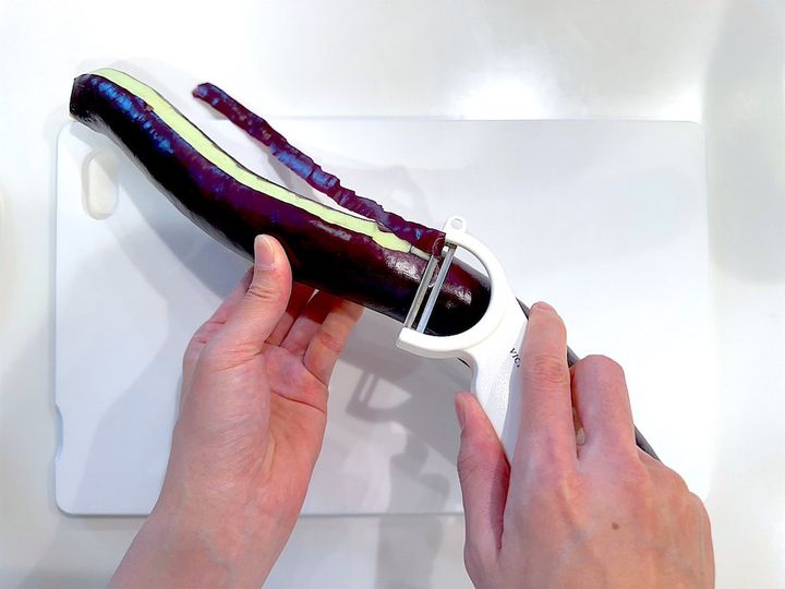 1. なすはピーラーなどで皮を剥き、横半分の長さに切る。