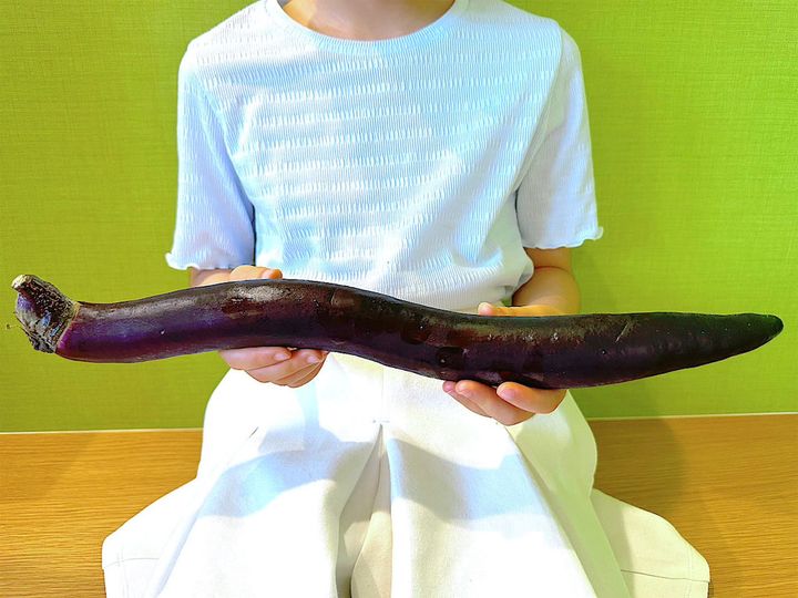 今回使ったのは、成長すると30〜40cmにもなる、大長なす。知らずにキッチンを通りかかった夫も、びっくりするほどの存在感です。8歳の娘に持ってもらいましが、その大きさ、お分かりいただけますでしょうか。