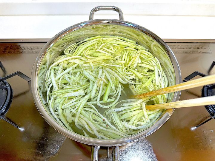 3. 沸騰させた湯(分量外)に2を入れ、なすが鮮やかな緑色になったら上げ、氷水(分量外)で冷やす。