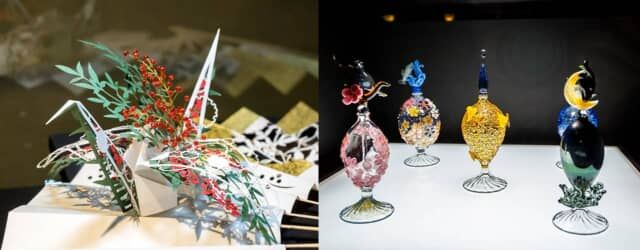 上写真左は濱 直史氏の作品で扇子の上に折鶴を乗せた「扇子折鶴~南天」。折鶴の上層は雪模様、下層には南天の葉を切り絵にして、赤いビーズで立体的な南天の実を表現。右はキタガワアキコ氏のガラス細工で、繊細な造形美に見とれてしまいます。このような「見てはいけない」作品たちが「清方の間」に飾られます。