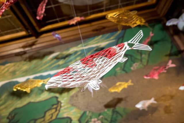 同じく「草丘の間」には、新潟の印刷会社 DI Palette のぺーパークラフト「紙にしきごい」が宙を泳ぎます。新潟県長岡市発祥の錦鯉の姿をレーザーカッティング技術で再現。滝登りをした鯉が龍に生まれ変わるとの言い伝えを具現化しています。