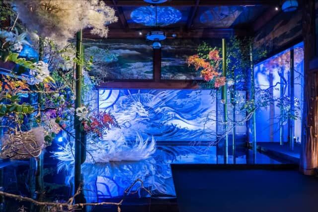 広間の奥には水墨画家小林東雲氏により龍の画が描かれ、周囲に一葉式いけ花の家元粕谷尚弘氏があでやかな草花を飾ります。川の上流にある竜門を昇った魚が龍となる伝説を、水墨画と床のリフレクションを巧みに使いドラマチックな空間に仕上げています。