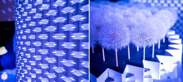 上写真左の天まで伸びる不思議な植物は、細かく折り曲がった紙と光が抜ける穴の連続で構成。右は本物のたんぽぽの綿毛が使われています。