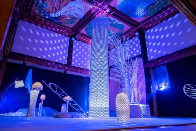 天女に会うべく階段を昇り進めた来場者ですが、「頂上の間」に天女はおらず、展示作品の記憶と天女への憧れを心に秘めて会場を後にしなければいけません。照明作家の弦間康仁氏の作品は、紙や植物を使い360度放たれる光が周囲を異世界のように変換しています。