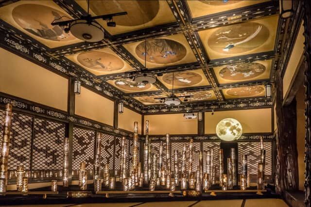 ▲日本画家荒木十畝が天井に花鳥図を描いた「十畝の間」には竹灯籠が光ます