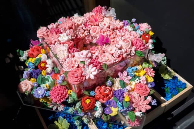 世界中のおとぎ話や神話では「絶対に見ないで」と言われても、好奇心に負けて見てしまい、無残な結末を迎える神話や物語がよくあります。「清方の間」には、見ずにはいられない数々の美しい作品を展示。すべで見ないではいられません! 写真は「和のこと遊び」。四角い布を折りたたんで花びらを作る “つまみ細工” を2,000個以上使った美しい作品です。