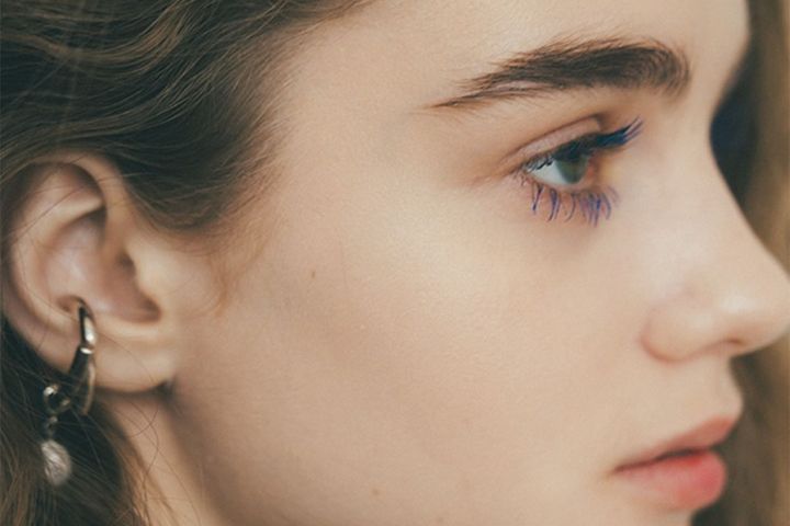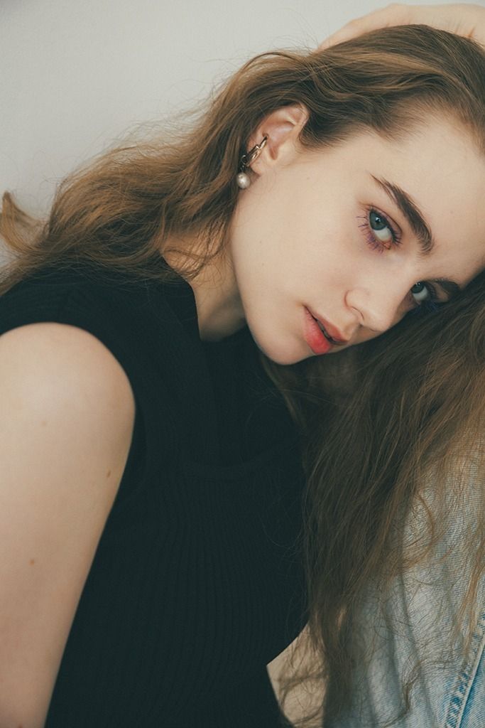 ヴィヴィッドな発色のカラーマスカラを相棒に、清楚で品のいいパールをカジュアルダウン。一見ノーブルと思いきや、至近距離では個性がにじむブルーの色みが粋。 リブトップス 7,997円/THROW by SLY(バロックジャパンリミテッド) パールイヤカフリング 5,500円/loni