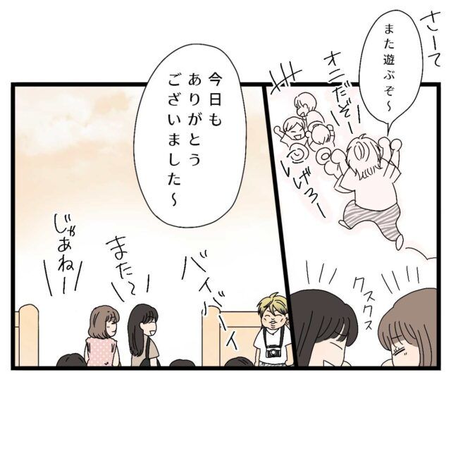 子ども達と楽しそうに遊ぶ信也さんの姿を見て楽しそうに笑うママさん達、