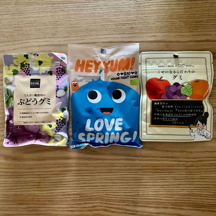 左から:スーパーLIFEのオーガニックブランド「BIO-RAL」のてんさい糖を使ったグミ、ビオセボンで購入したビーガンフルーツグミ、友利新先生が監修されているこだわりのグミ。グミ好きの子どもが多いからか、最近からだにやさしいグミが増えてきました!