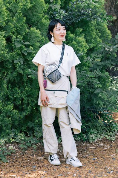 どうしてもカーキや黒が多くなるアウトドアスタイル。アウトドアブランドDODのプレス・棚村さんは、思い切ったオールホワイトコーデが印象的です。 「アウトドアの時、汚れを気にして、白のアイテムは避けがちですよね。テントやタープの下は少し暗くなるので、白のアイテムはパッと明るい雰囲気を作ってくれます。太陽の下での写真も映えますよ」 DODのウェアは、おしゃれなうえにアウトドアで着ることを想定して作られています。しゃかしゃか素材のパンツや撥水パーカが、強い味方に。 「スカートパンツは、セパレートになっていて2WAYで着られます。キャンプや旅行のとき、2日目に気分を変えて楽しむこともできます。着替えとして持っていく際も、軽くてコンパクト。畳みジワも気になりにくいのもうれしいです」