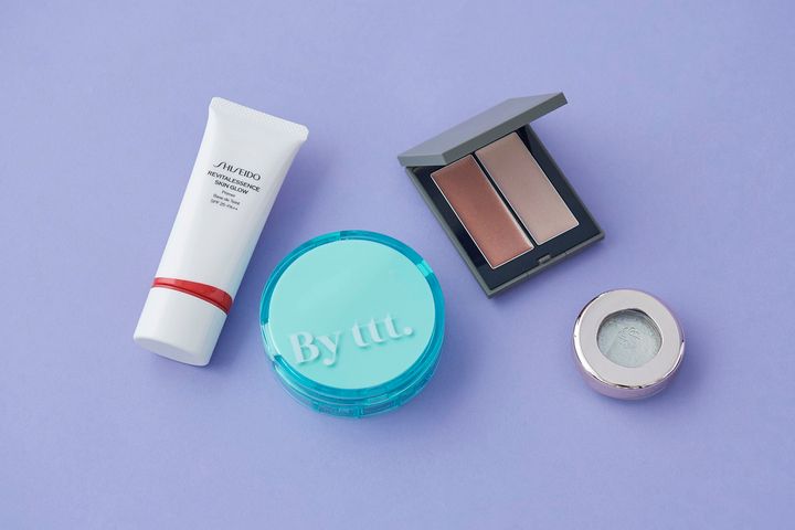 〈コスメ〉左から・エッセンス スキングロウ プライマー SPF25・PA++ 30g¥5,280/SHISEIDO クリア デイリー クッション SPF50+・PA+++ 全2色 ¥2,970/バイティースリー シマリング グロー デュオ 01 ¥4,950/スリー ダズリング ジェム 01 ¥3,520/コスメデコルテ 〈モデル〉トップス¥12,100/ルコックスポルティフ ゴルフ