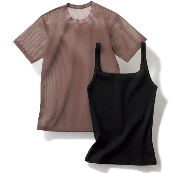 NY発大人気アンダーウェアブランドのメッシュTシャツ。他にはない洒落度抜群のあずき色が新鮮! トップス¥8,800(オーバーニース/ウィム ガゼット 玉川髙島屋S・C店)キャミソール¥6,600(サロン アダム エ ロペ)