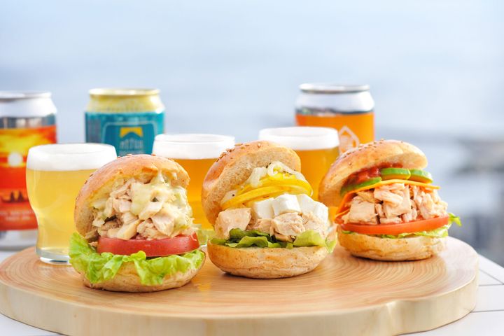 お待ちかねの「カンカンバーガープレート」が登場。手のひらサイズのハンバーガーは夏らしい食材や静岡にちなんだアボカドサルサ、レモン、わさびの3種類のフレーバー。ハンバーガーのパティには身を大きくほぐしたツナ缶が使われており、ツナ本来の美味しさが味わえるのはもちろん、食べごたえも十分。また、それぞれのハンバーガーとのペアリングを楽しめる3種類のクラフト缶ビールをセレクト。「ビールとハンバーガーを一緒に味わうことで両方のよさが引き立ちますね」(おざみさん)