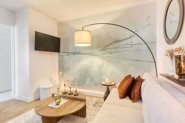 リビングルームには床から天井まですりガラスの窓があり、日中は自然光で満たされている。広々としたリビングエリアには、オレンジカラーの冷蔵庫とコーヒーバーを備えたキッチンもある。カップルや一人旅に最適なAirbnbで、街で最もホットなレストラン、バー、カフェがすぐ近くにあるのも高ポイントだ。運河沿いの1.6kmの地上遊歩道を時間をかけて歩きながら、地元民気分を味わおう。